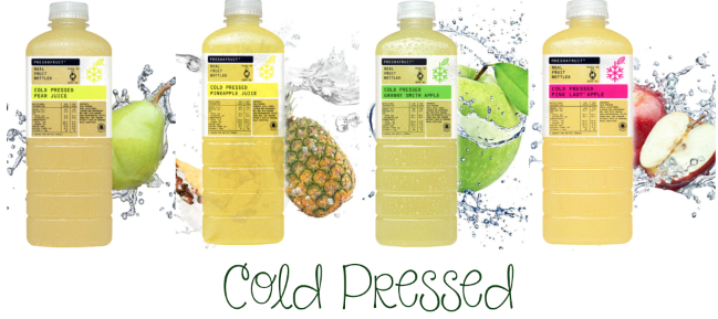 Falvours-Cold PressedPink Lady Apple, Cold pressed pineapple juice, Cold pressed pear juice, Cold Pressed Granny Smith Apple.